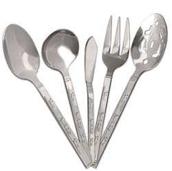 2 Spoons, Pasta Server, One Ladle, One Flipper/spatula, and one fork all engraved. 18/0 Stainless